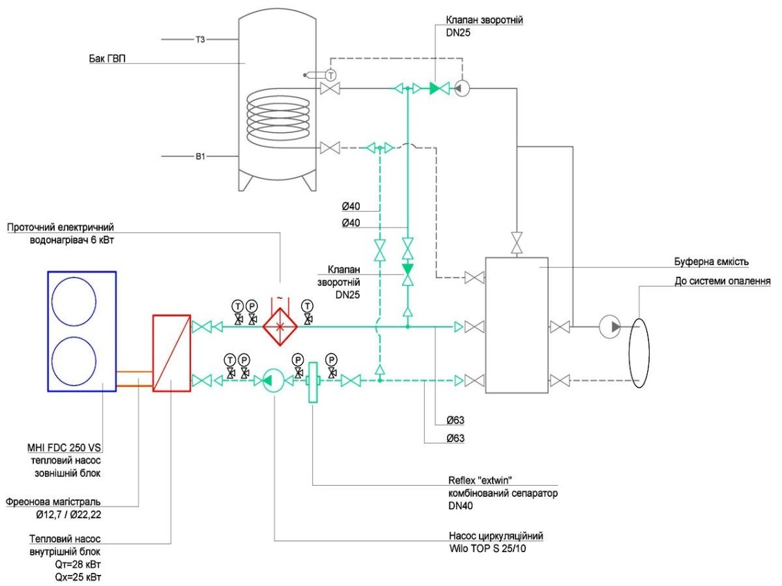 Вартість врізки теплового насоса в існуючу систему опалення: 28093 грн. Вартість самого теплового насоса Mitsubishi Heavy 28 кВт - $9800.