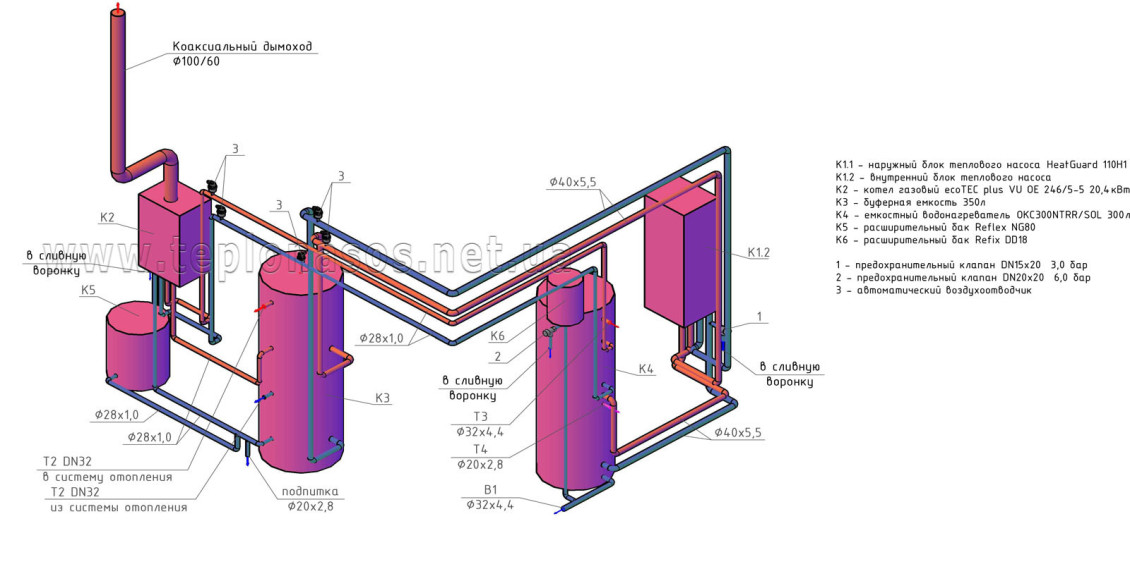 Що було зроблено: змонтований тепловий насос і до нього підключений існуючий газовий котел. Об'єм системи опалення збільшений на 1000 л за допомогою бака-акумулятора.