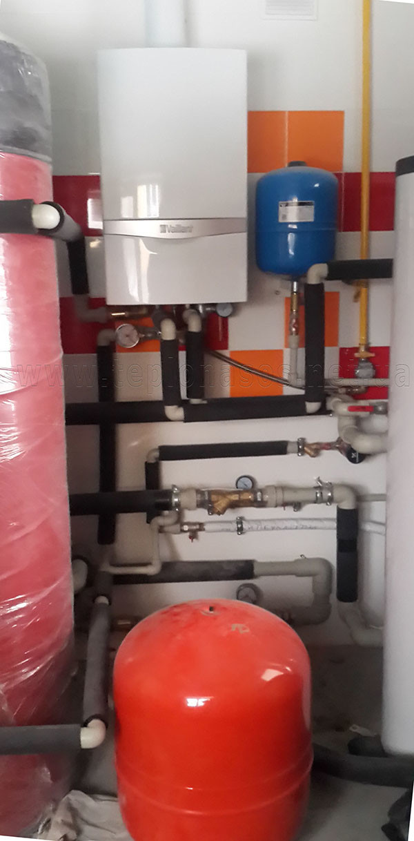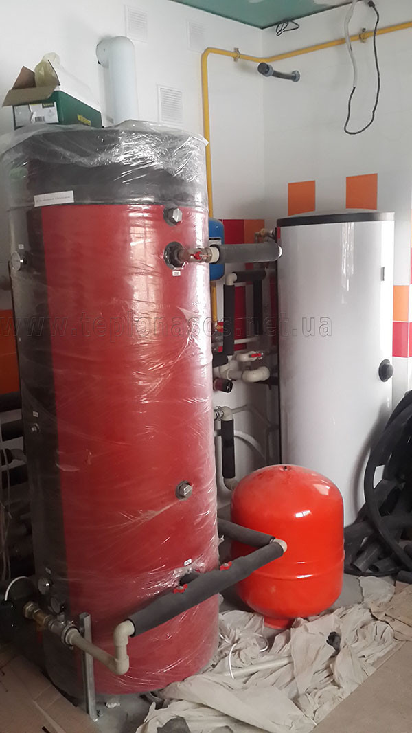 Що було зроблено: змонтований тепловий насос та повністю котельня. Об'єм системи опалення збільшений на 500 л за допомогою бака-акумулятора. Змонтовані фанкойли.